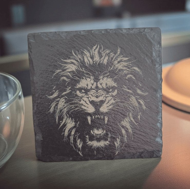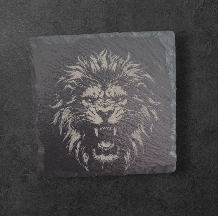 A striking natural slate coaster, etched with the fierce face of a roaring lion. This bold design captures the strength and wild spirit of the king of the animals, bringing a touch of drama and character to your home.