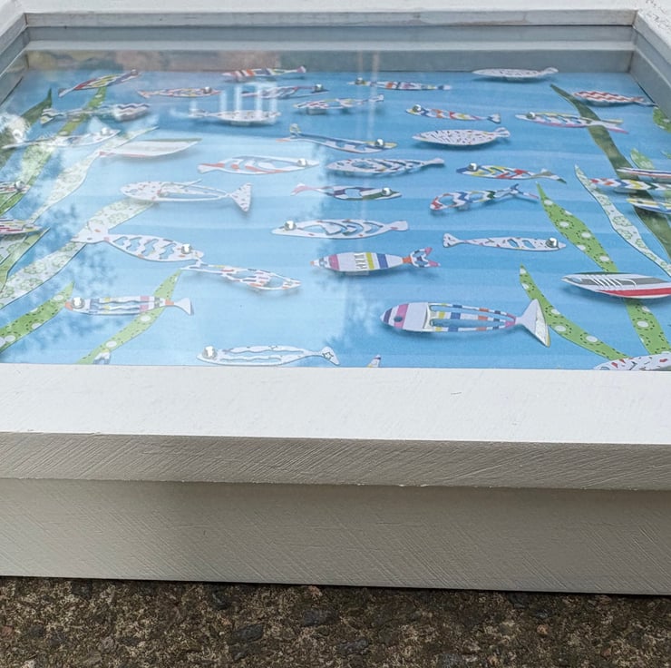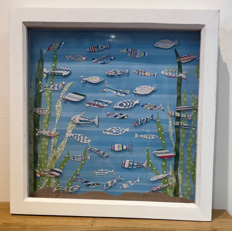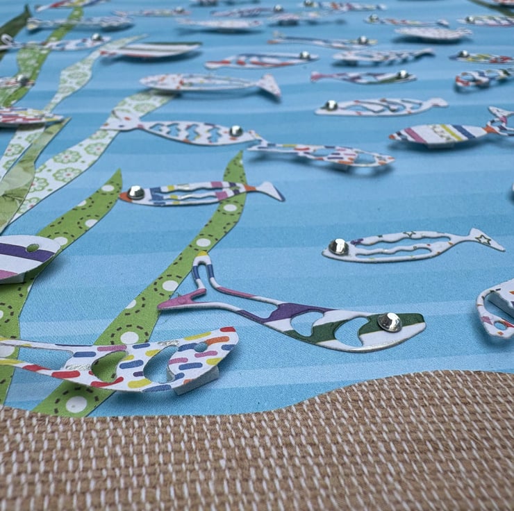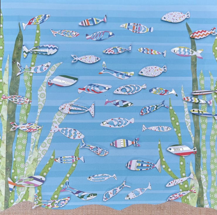 I like to experiment with different papers and colour combinations to make a unique result. This piece is my interpretation of ‘fish in an aquarium’.