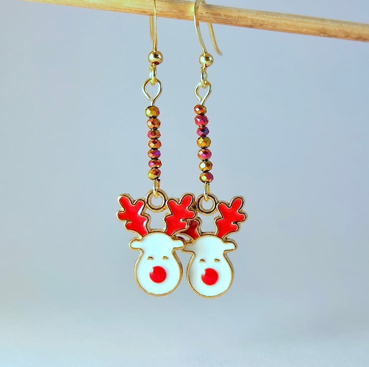 Sweet little reindeer charm earrings topped with seven 2x1.5mm faceted rondelles in a sparkly metallic red and gold colour.