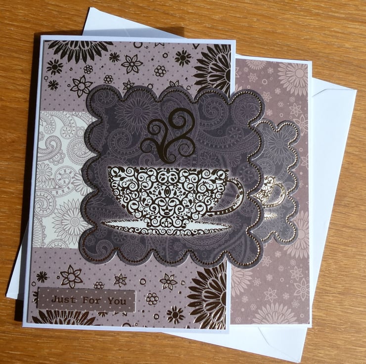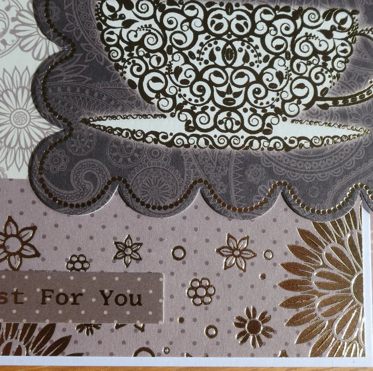 With images of steaming cups of tea and the message Just For You, this birthday card in shades of coffee, chocolate and gold would be ideal to send to someone who loves a cup of tea. Or as a card for a friend who you love to have a tea and a catch up with.