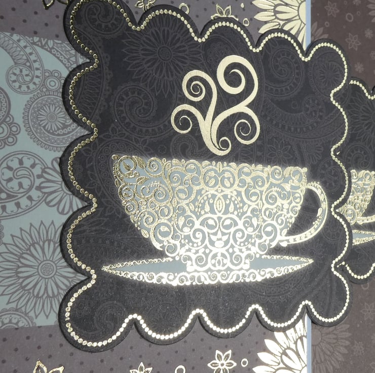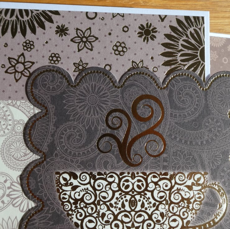 A square image of a steaming cup of tea in a saucer with gold foiled details has been mounted onto a strip of cream card printed with a paisley swirl design in pale brown with borders of an abstract gold foil floral design on a brown background.