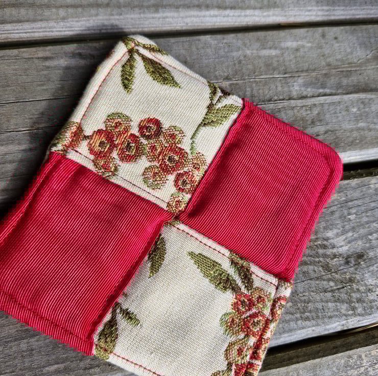 The back is in an autumn berries woven cotton mix fabric, which is also used on the front with patchworked bright red watermark silky viscose fabric. Ideal for the Christmas table or any time of year.