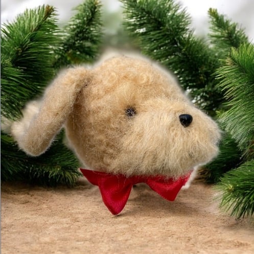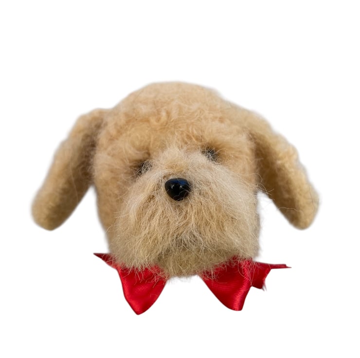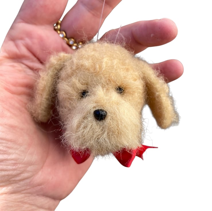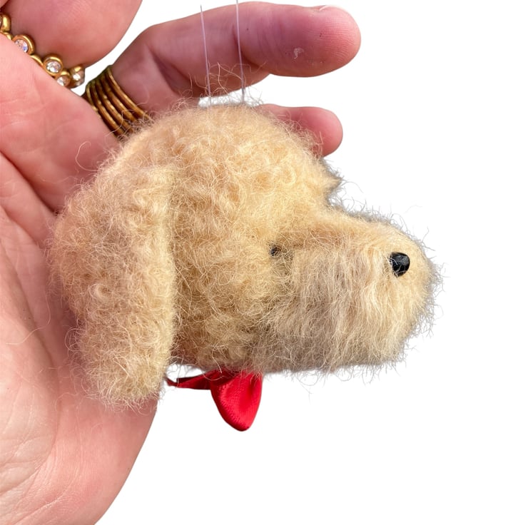 A wonderful pale amber Cockapoo needle felted dog head bauble handmade from natural woollen fibres which have been sculpted into shape using a barbed felting needle. A black plastic nose and eyes have been added along with a bright red ribbon bow at the neck. A clear nylon thread has been added to facilitate hanging. This cockapoo would make a beautiful keepsake for any dog lover.