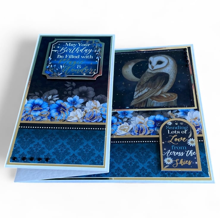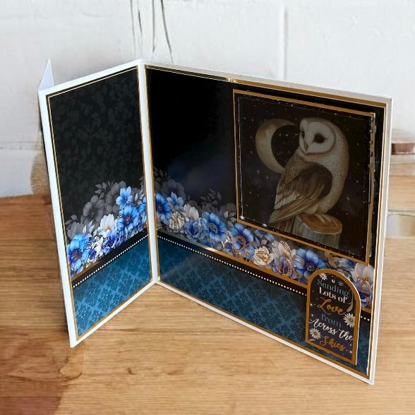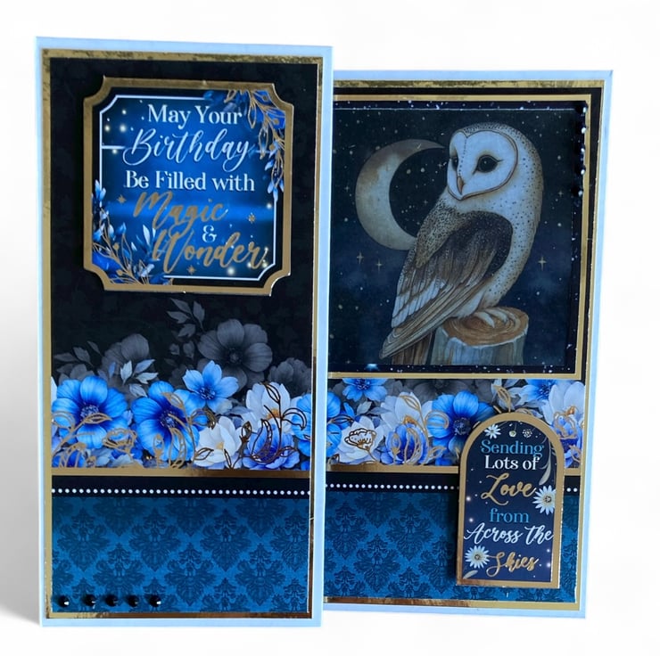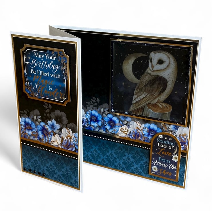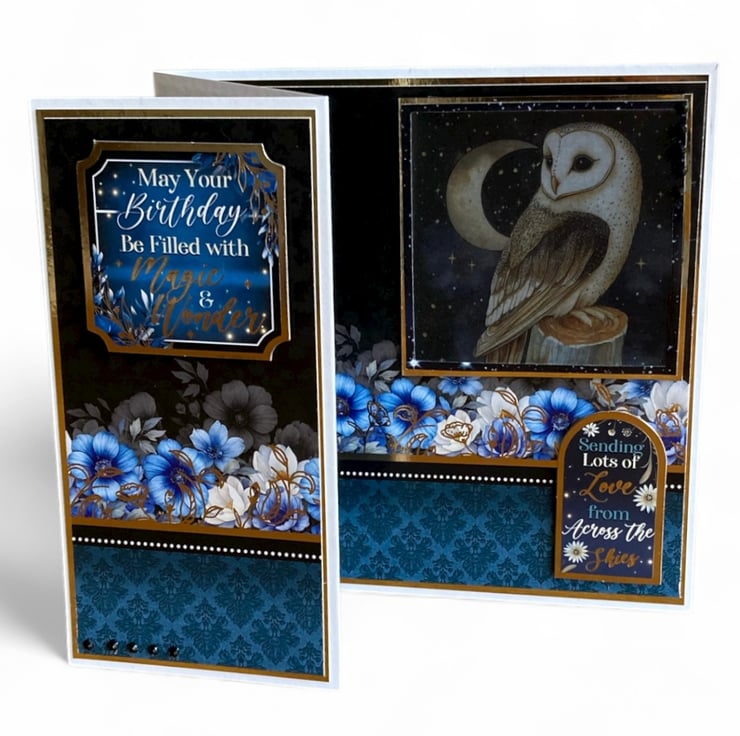 Celebrate a special birthday with this enchanting handcrafted zigzag card, featuring a whimsical nighttime feel. The design is beautifully brought to life with a striking owl printed on parchment paper, adding a unique texture and dimension.