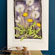 Framed original watercolour and ink painting, 'Dandelion'