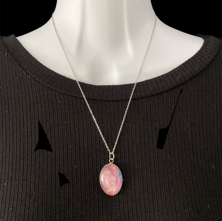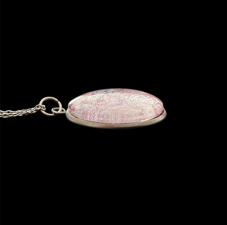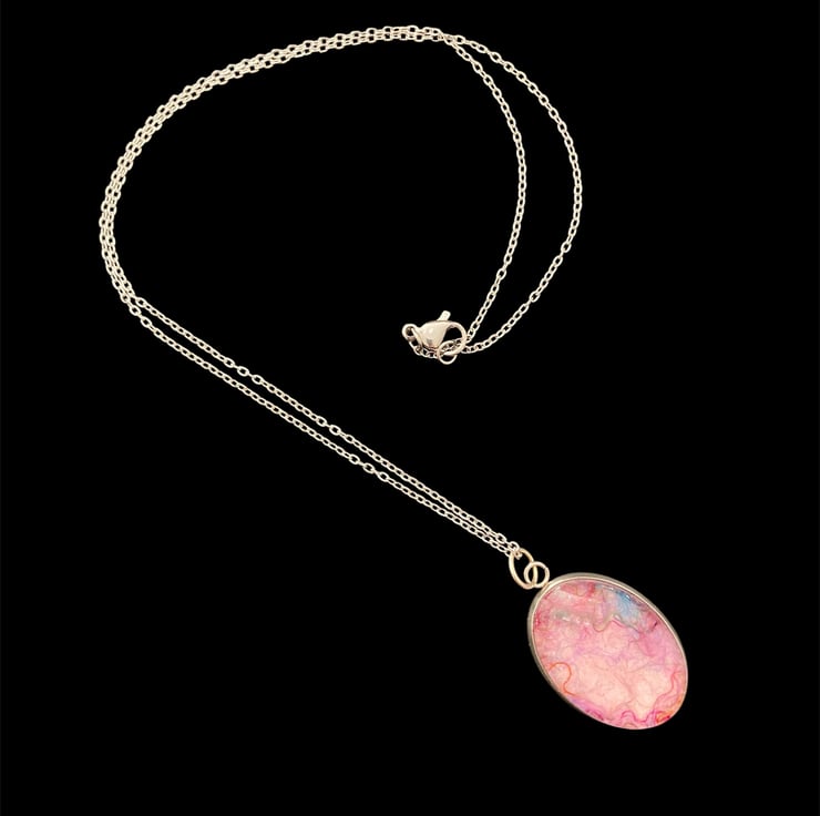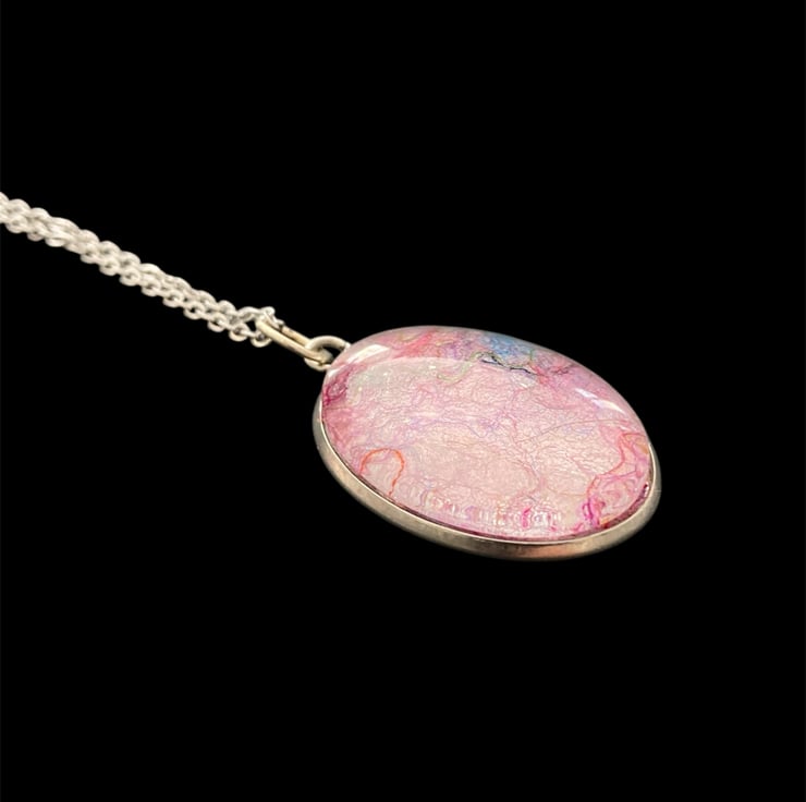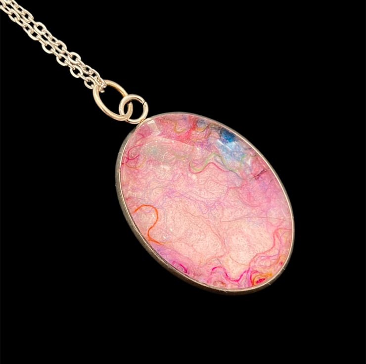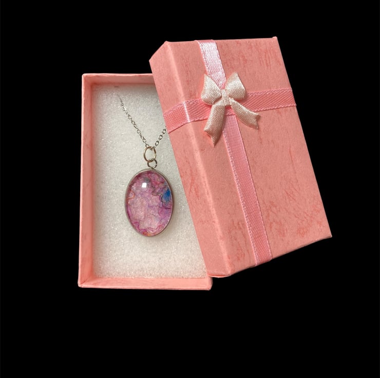 A unique felted pendant that will add a pop of colour to any outfit. Made using a piece handmade pale pink felt topped with silk fibres to create an abstract pattern. The felt has been set within a durable stainless steel oval pendant tray and covered with a glass cabochon that enhances the colours and textures beneath. The pendant measures approximately 25mm x 18mm and is supplied with an 18" silver coloured stainless steel chain with a lobster clasp. A pretty pink gift box is available as an option but will result in increased price to cover box and additional postage costs.