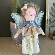 She is made from a variety of fabrics both vintage and modern, and she has handmade wings. I have created her hair from merino yarn