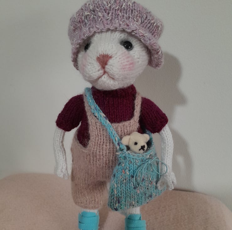 These kitten kids are a smaller version of my previous cat doll . They measure approximately 11" (28cm). This listing is for the pink kitten. Her body is knitted in alpaca yarn with her clothes in a combination of wool and cotton. The legs have support to allow her to stand with some additional weights in the end of her tail for extra balance.
