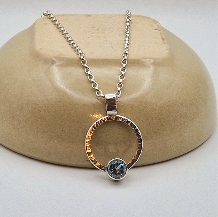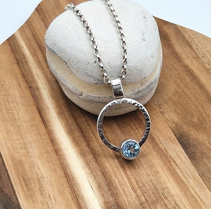 This lovely pendant shines and sparkles in the sunlight and was inspired by the beautiful blue skies of the seemingly endless summer we've had (now ended!). It is made from sterling silver square profile wire formed into a circle. The wire has been textured by hammering it with the flat end of a rivet hammer to pattern the wire with lots of tiny lines. The bail of the pendant has also been hammered in the same way and has been soldered to the top of the pendant. The gorgeous faceted Sky Blue Topaz has been set in silver and the setting has been inset into the bottom of the circle. The pendant would make a perfect gift for that special person or would make a lovely treat for yourself.
