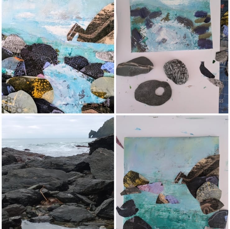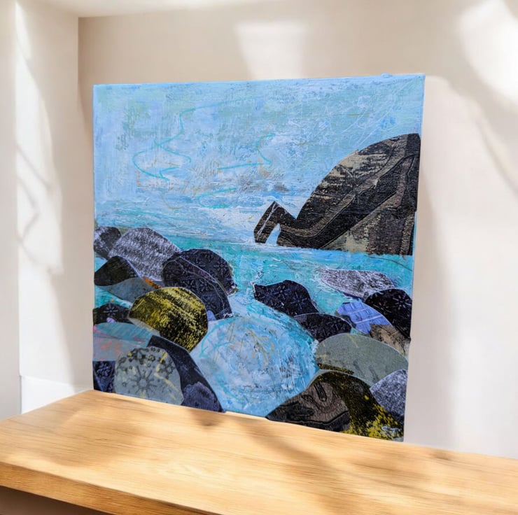 Original collage of Horses head Rock at Prawle point, Devon on 15x15cm board. Materials used Gelli printed card and papers , acrylic paint, oil pastel and posca pens.