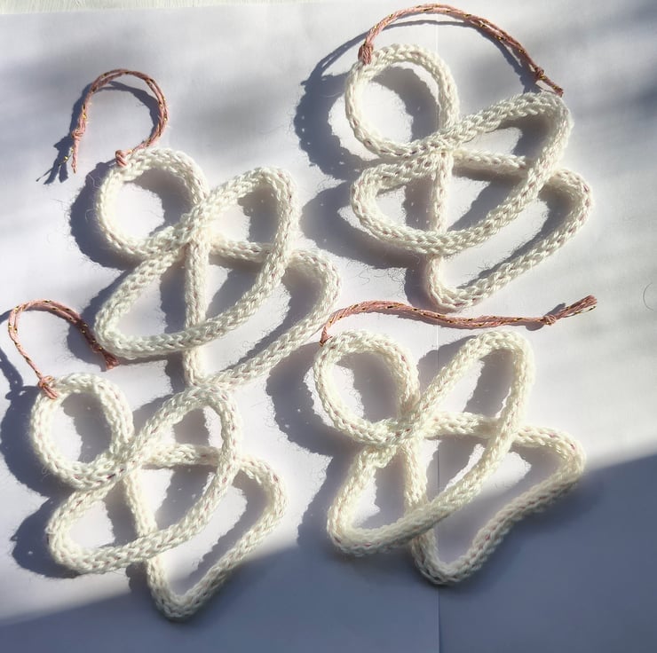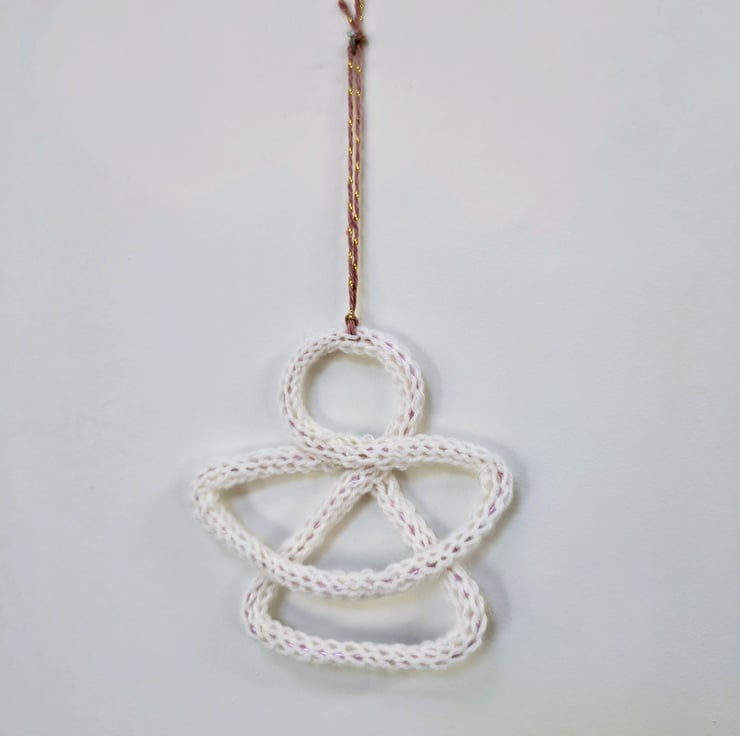 This sweet little angels are a perfect addition to your Christmas tree or garland. They have been carfully knitted from white yarn and their internal wire is a delicate shade of pink which peeps through the knitting and matches their sparkly pink twine loop to hang them on the tree.