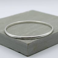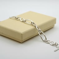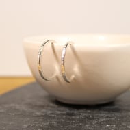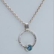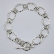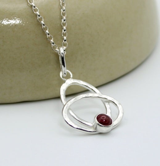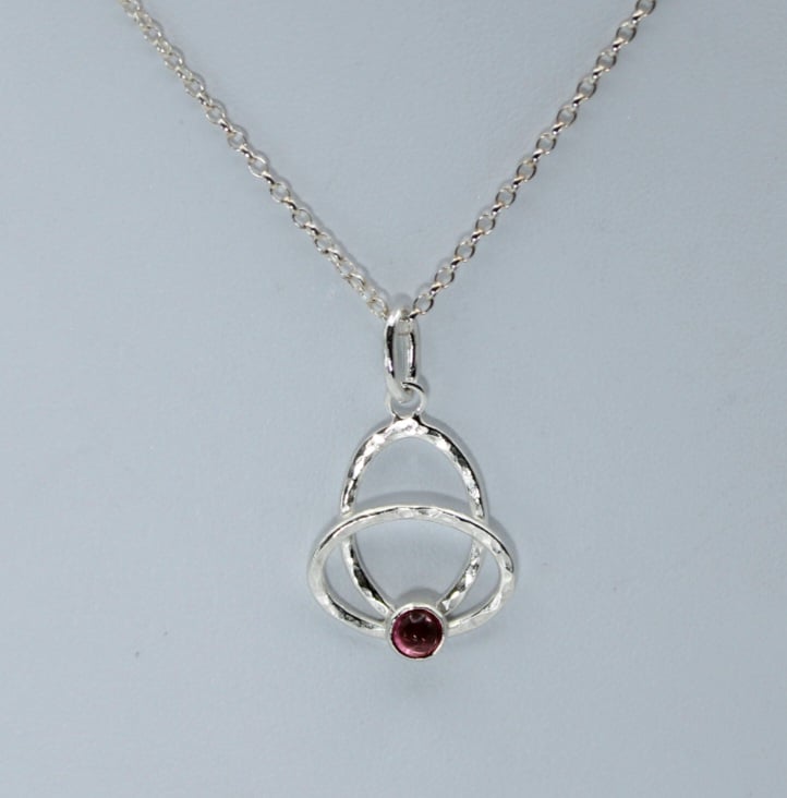 The pendant is made from two oval shapes which have been soldered together, one on the vertical and one on the horizontal. The ovals have been hammered with the rounded end of a ball pein hammer to give texture and to reflect light. The pendant is suspended on my hand made silver bail and is hung from an 18 inch fine oval belcher chain which is detachable from the pendant.