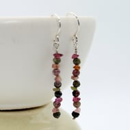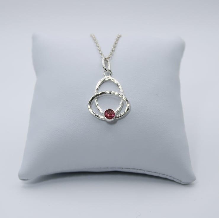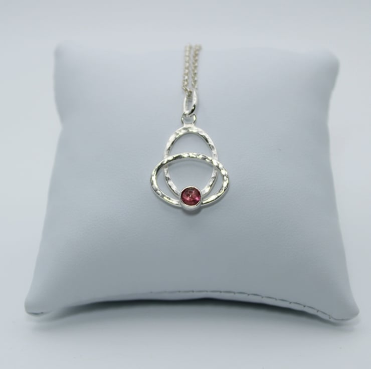 This is a sterling silver pendant set with a smooth pink Tourmaline cabochon stone. (A cabochon stone has a domed top). Tourmaline is one of two birthstones for people born in October, Opal being the other stone. This tourmaline is a lovely mid rose pink.