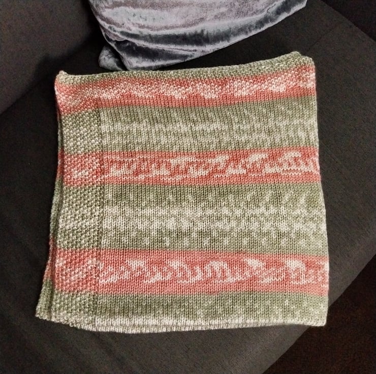 Knitted in gentle shades of sage green, salmon pink and cream, the Fair Isle effect gives it a timeless, unisex look that works beautifully for boys, girls, or surprise arrivals.