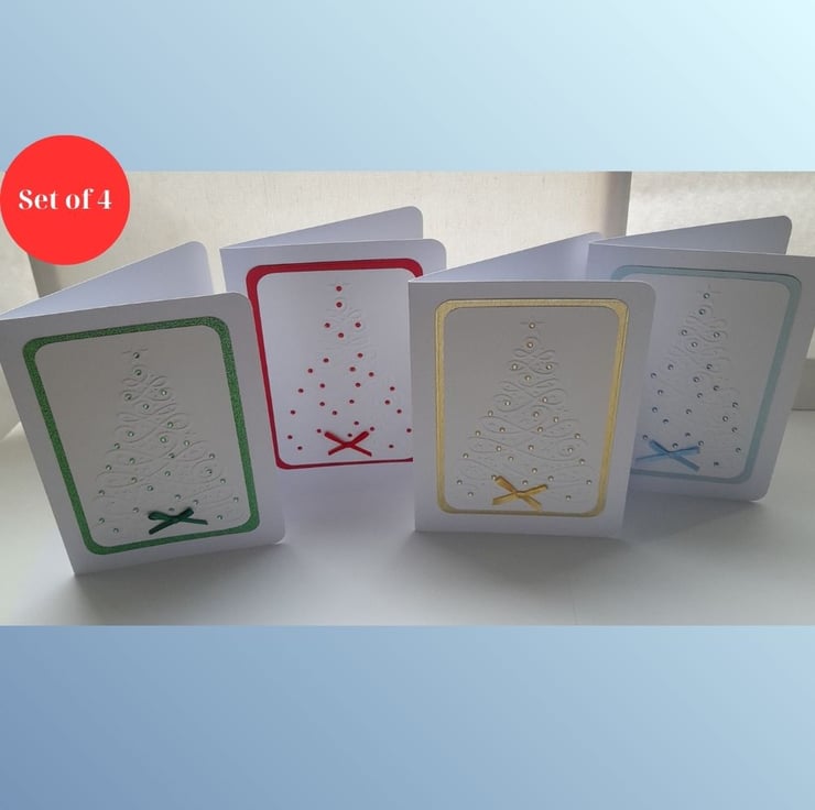 This set of 4 Christmas cards uses a simple but elegant design of a swirl embossed Christmas tree with star and snow detail, highlighted with shimmering gem baubles in a variety of colours. The design is finished with a coordinating satin bow and matching mat layer on white card.