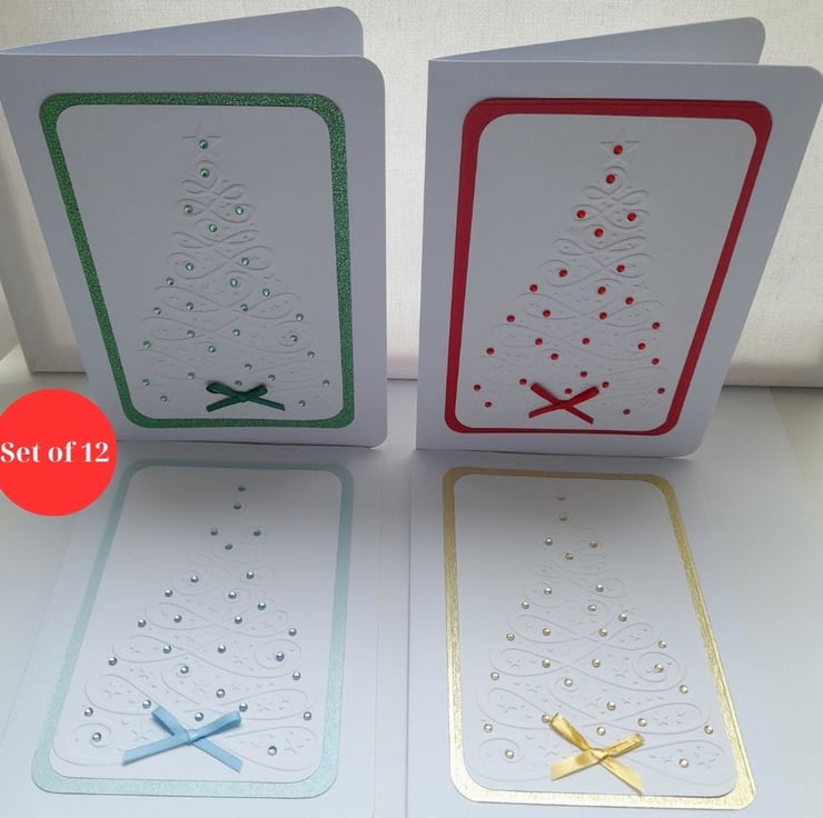 This set of 12 Christmas cards uses a simple but elegant design of a swirl embossed Christmas tree with star and snow detail, highlighted with shimmering gem baubles. This multi pack of 12 cards consists of 3 of each of the Gold, Red, Green and Blue cards. Each design is finished with a coordinating satin bow and matching mat layer on white card.