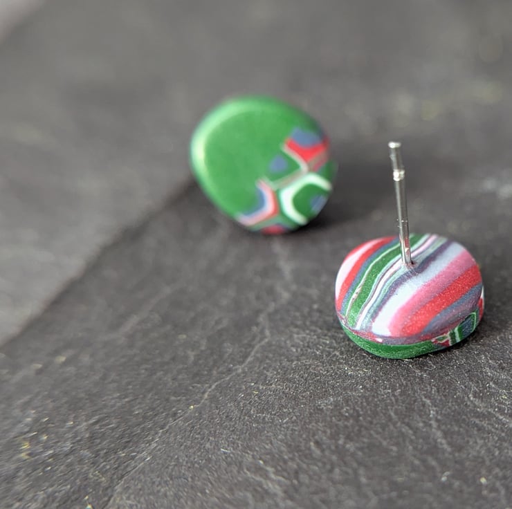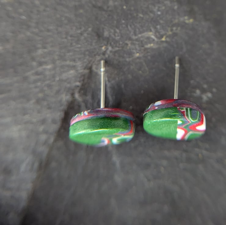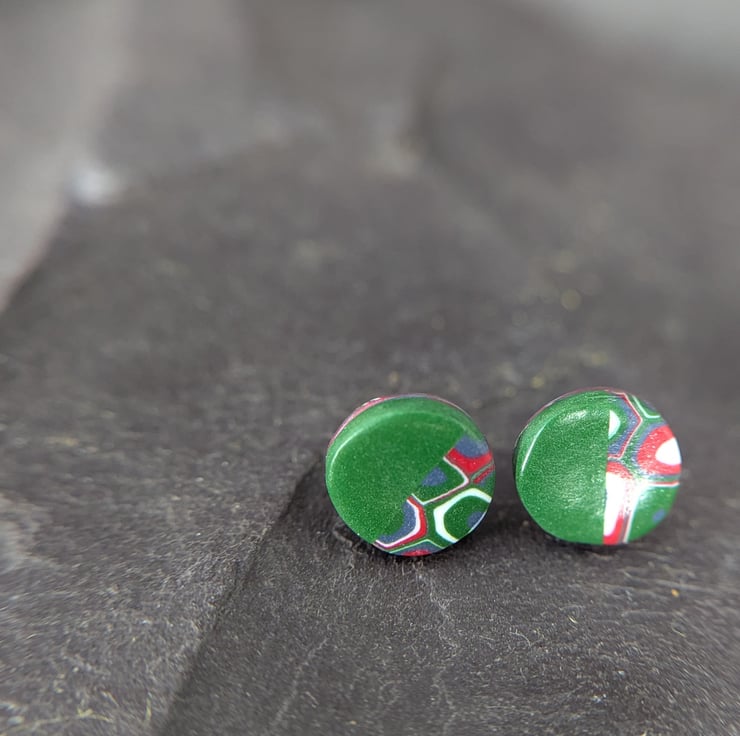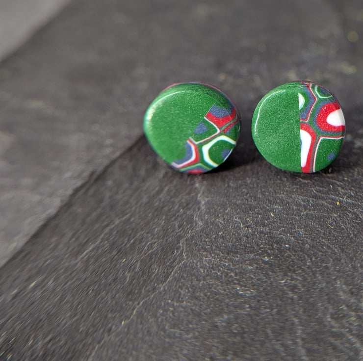The main part of these studs have forest green with a slight sheen, and then added is a retro pattern of red, green, grey and white. These will add another dimension to your outfit, and could also be worn for the Christmas work days, or even for every day wear.