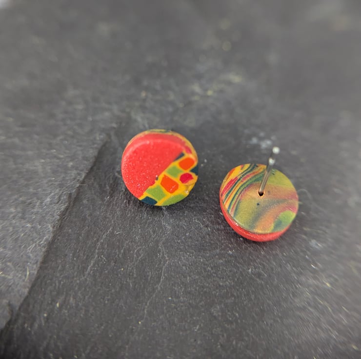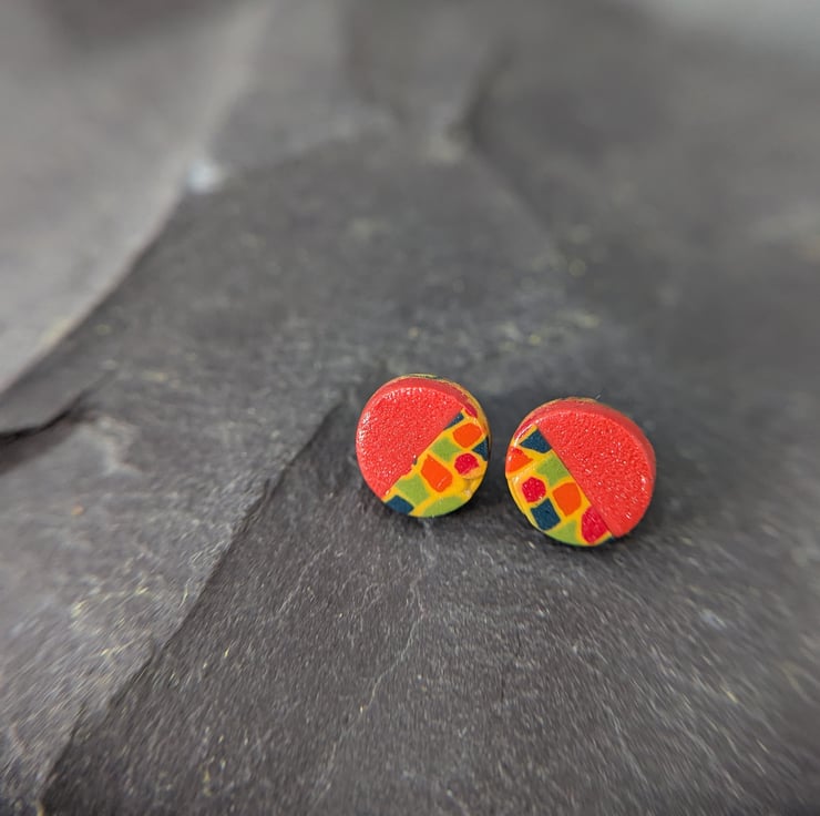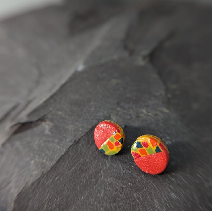 These earrings measure approximately 1cm diameter. Half of the earring is a red orange tone, with rest giving a mosaic touch, with tones of mustard, red, orange, green and dark teal.