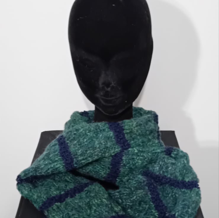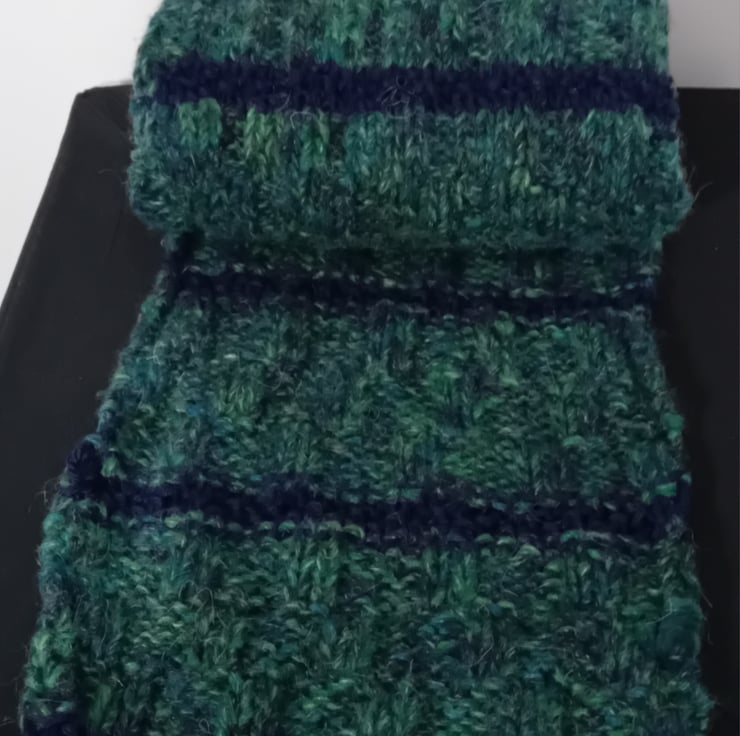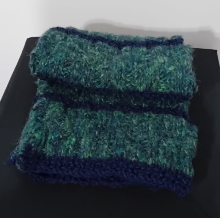 Handknitted blue and a green mix scarf. 100% Acrylic yarn. Size 24cm x160cm.