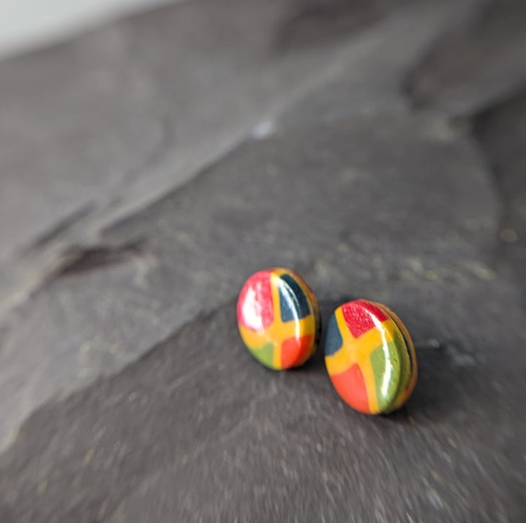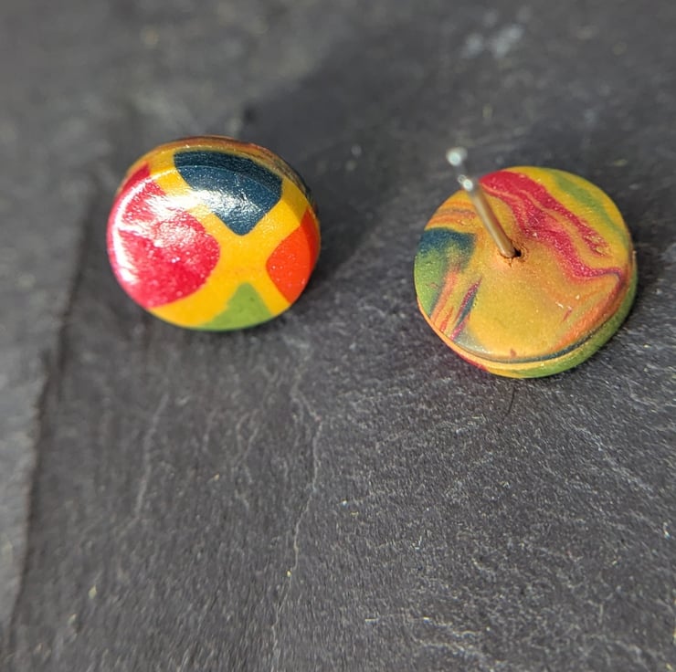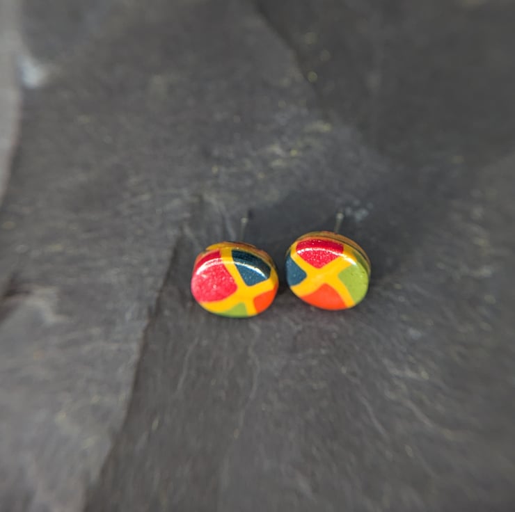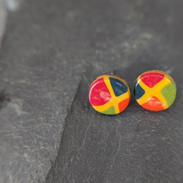 These are stunning earrings, with a glossy sheen and a slight sparkle to the clay. The colours are those of the season, mustard yellow, orange, green and a deep teal, creating a cross in the middle of the stud.