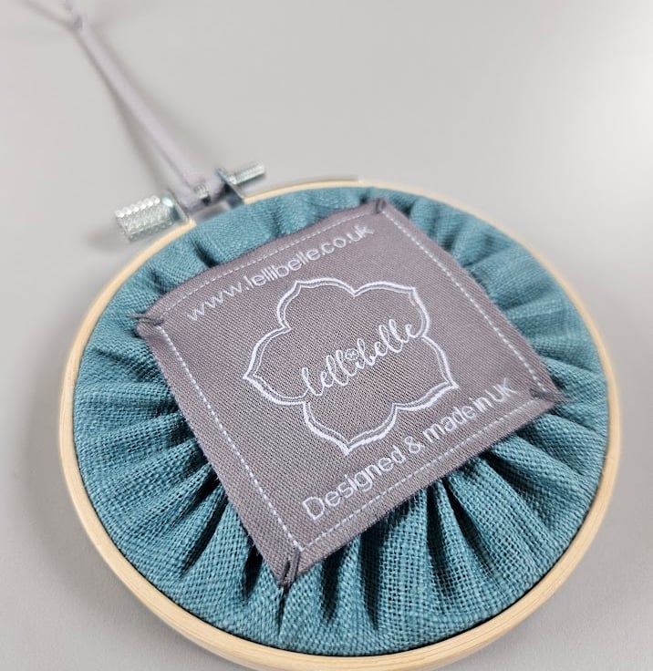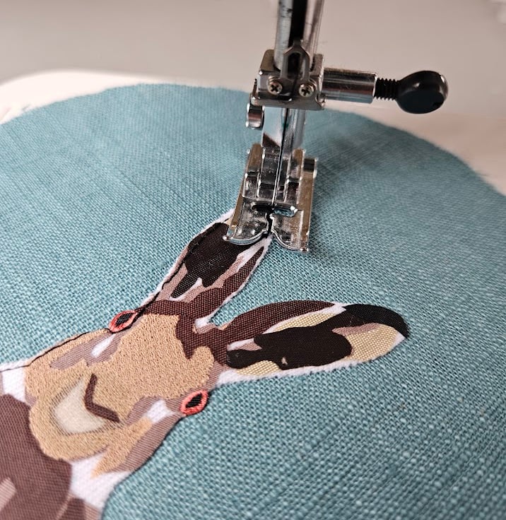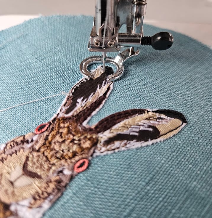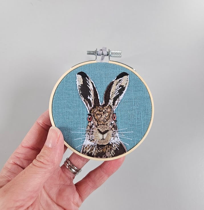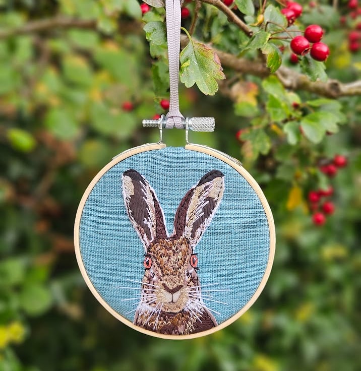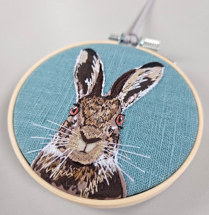 This charming mini hoop features a hare design created with fabric appliqué and finished with free-motion machine embroidery. Perfect as a hanging decoration, it adds a touch of handmade character to any space.