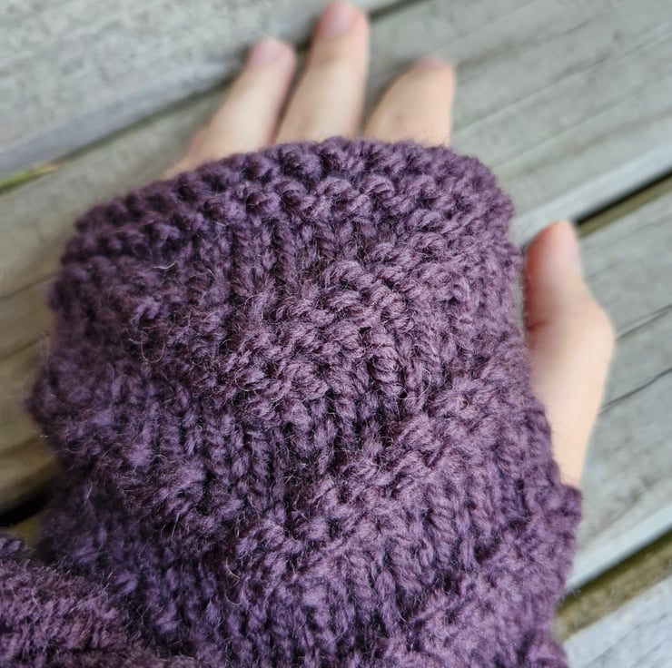 Cosy hand knitted winter wrist warmers or fingerless gloves dark plum size s-m