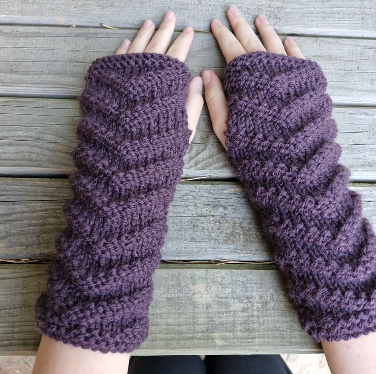 These wrist warmers or fingerless gloves are handknitted from a dark plum or dark grape yarn.