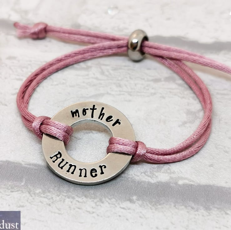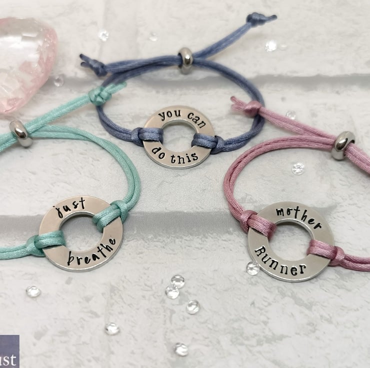 Bracelet made from hand-cast pewter hand-stamped with a fun quote/pun on an adjustable satin cord in the colour of your choice, with Stainless Steel slider.