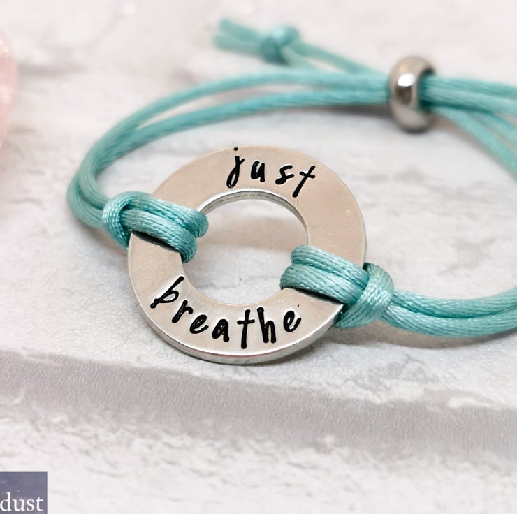 Bracelet made from hand-cast pewter hand-stamped with a beautiful quote on an adjustable satin cord in the colour of your choice, with Stainless Steel slider.