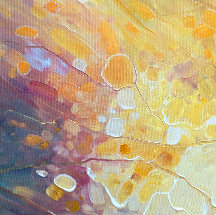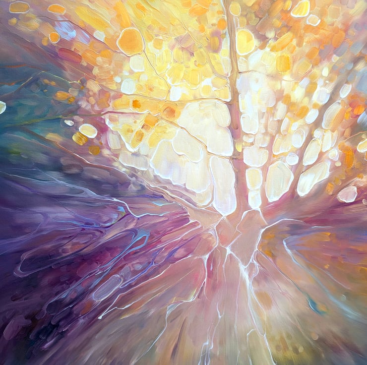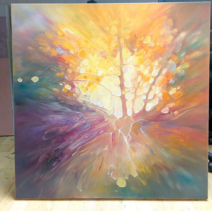 Autumn Beckons is an expressive, semi-abstract original oil painting of an Autumn path. It is 36x36x1.5 inches. The painting focuses on the centre of the painting where light is radiating out beneath the trees. It hints at revelation or hope or some kind of promise – or at least that is what it says to me! The painting was inspired by actual autumn walks in an around the Ashdown Forest (of Winnie the Pooh fame) and the Weald of Sussex where there are plenty of woodlands and copses and nooks and crannies that I never tire of exploring in different seasons. Painted on deep edge canvas, edges white, ready to hang and comes with certificate of authenticity.