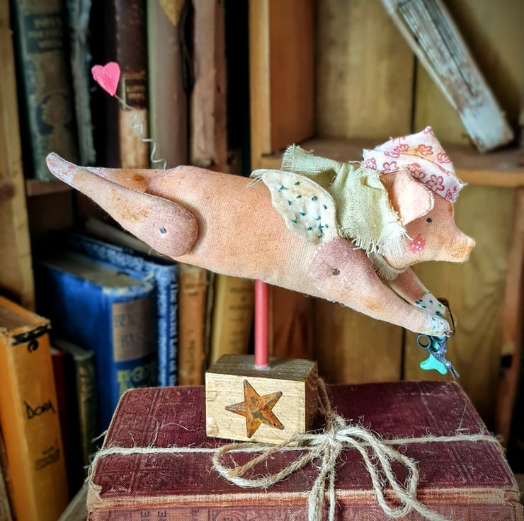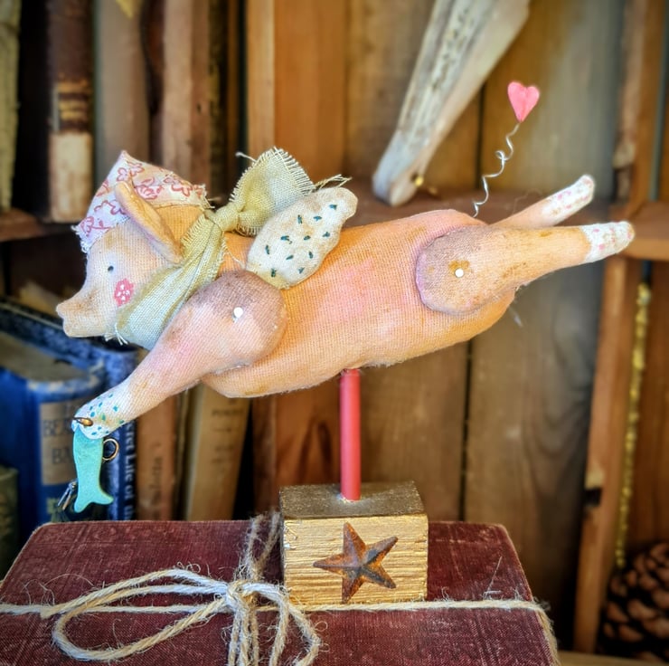 A whimsical flying pig handcrafted from stitched and painted fabric, complete with tiny angel wings. This one -of -a -kind folk art soft sculpture sits on a rustic wooden block, making him a fairytale inspired piece perfect for any mantle. His little fabric hat sits perched on his head and he has a calico hand dyed scarf around his neck.