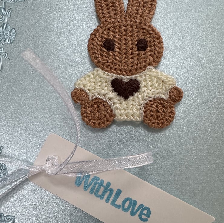 Make a little one’s heart melt on their special day with this cute card decorated with a ribbon tied greeting tag and a crocheted appliqué patch that can be removed and sewn onto items of clothing, toys, blankets, hats etc…