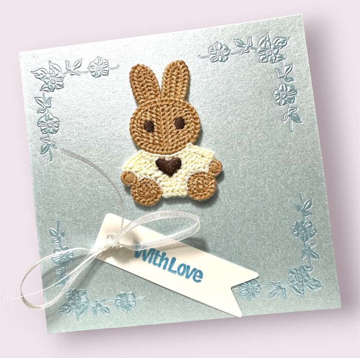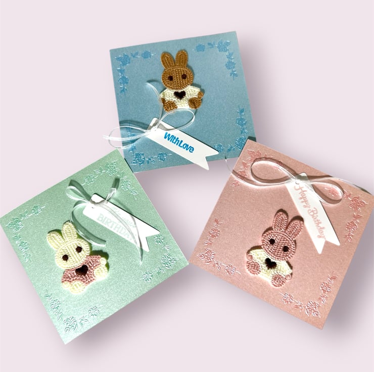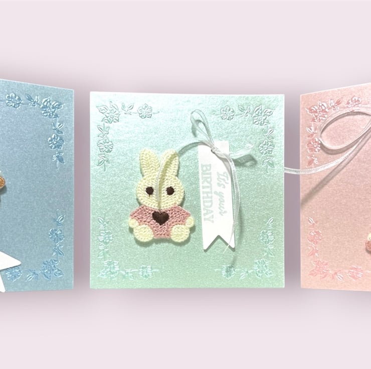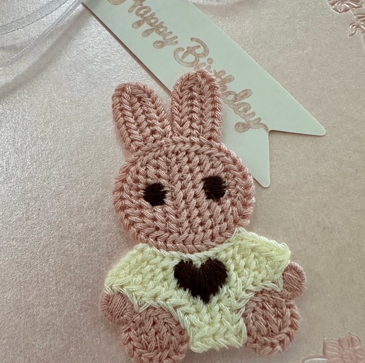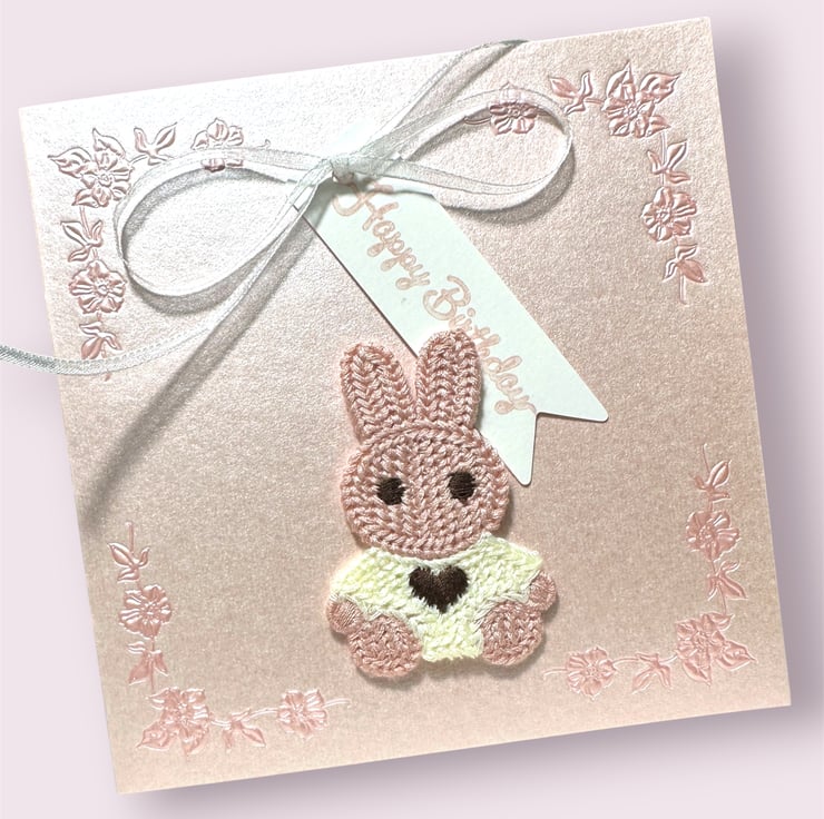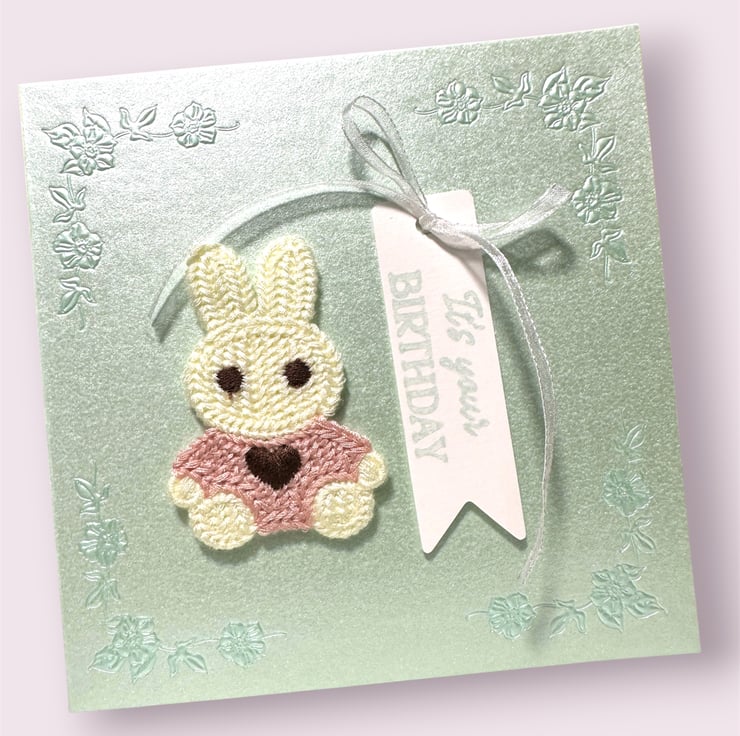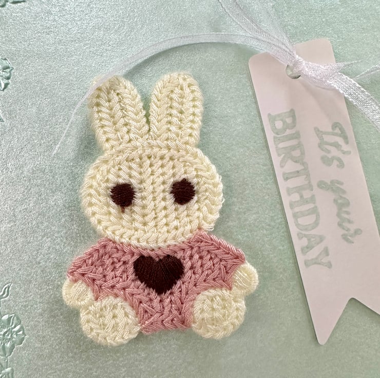 Birthday card baby, toddler, young child. Reusable fabric rabbit applique patch.