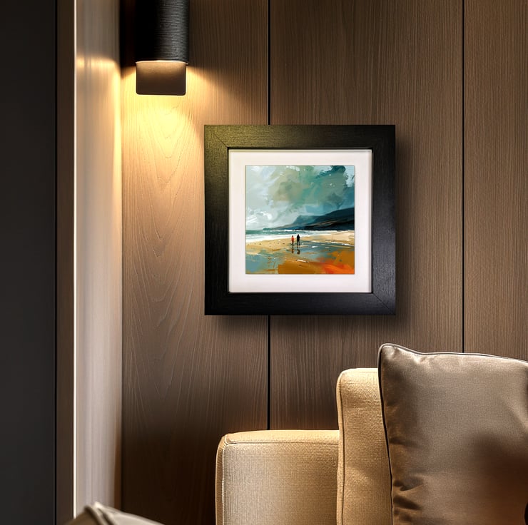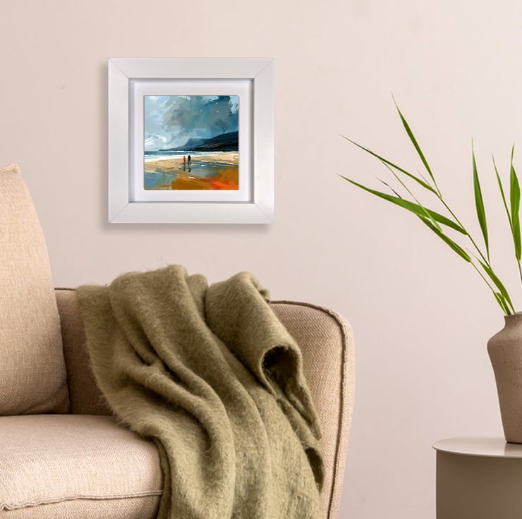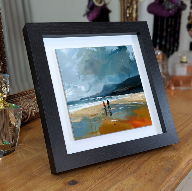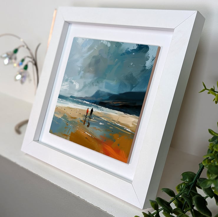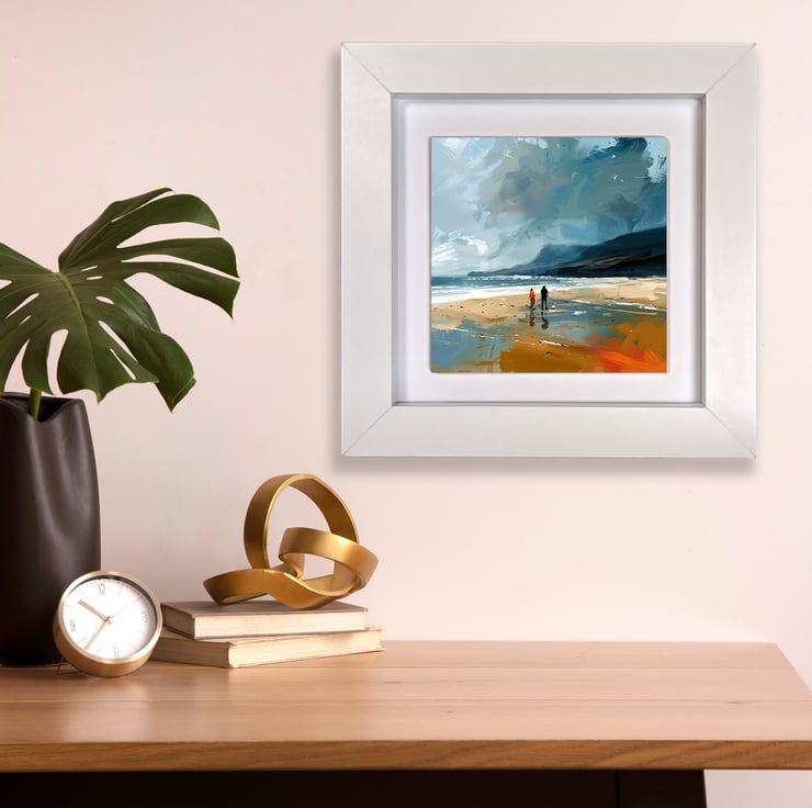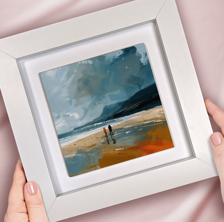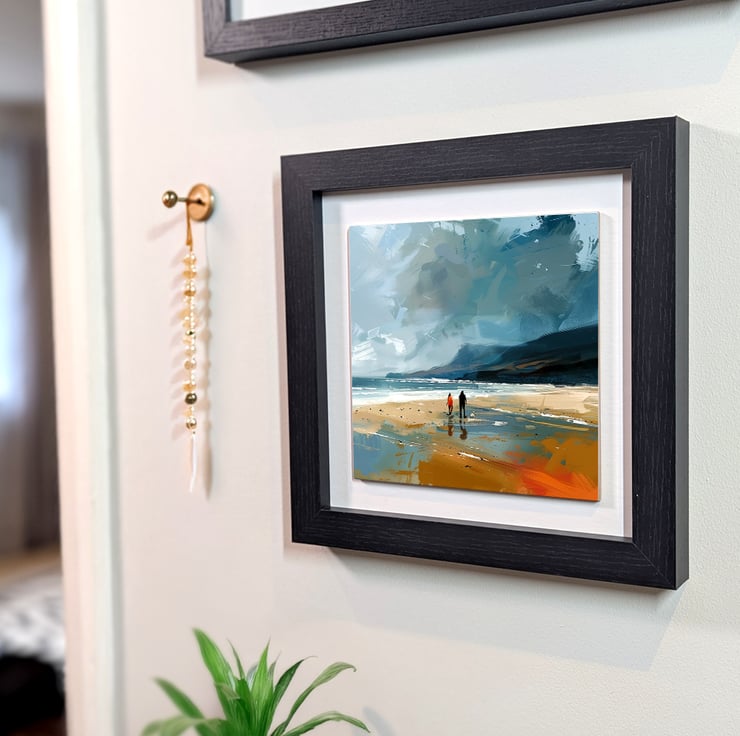 Coastal Couple captures a peaceful shoreline stroll beneath moody skies, evoking serenity and reflection. This expressive piece is perfect for adding a calming presence to any space. Ideal as coastal wall art, it blends painterly depth with handcrafted elegance – a beautiful choice for beach-themed home décor.