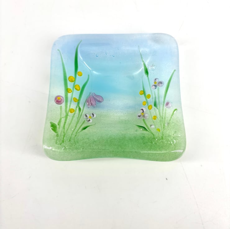 A lovely little dish with a pretty pink & yellow flower design, perfect for small items of jewellery or to house a tea light.