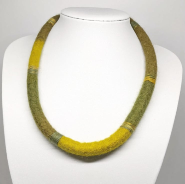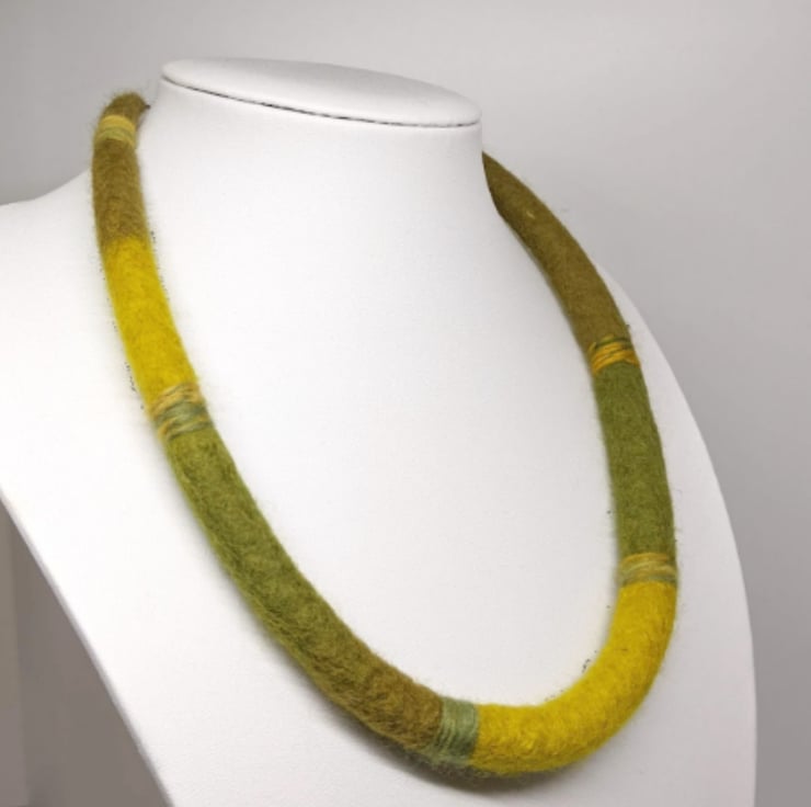 This striking necklace is wet felted from extra fine merino wool and shaped into a soft cord. The shades of olive, khaki and yellow green are complemented by toning wrappings of merino and silk yarn. Waxed cords complete the closure, and necklace size can easily be adjusted using the sliding knot, from 40cm to 68cm.