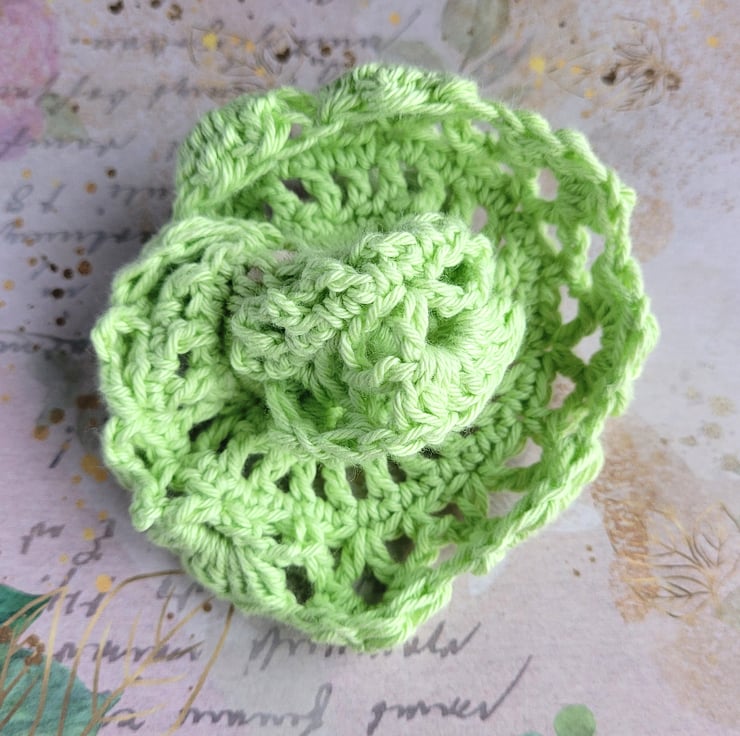 An intricate crochet lace hair scrunchie, handmade using a soft touch 100% cotton yarn, in a cheerful lime green colour