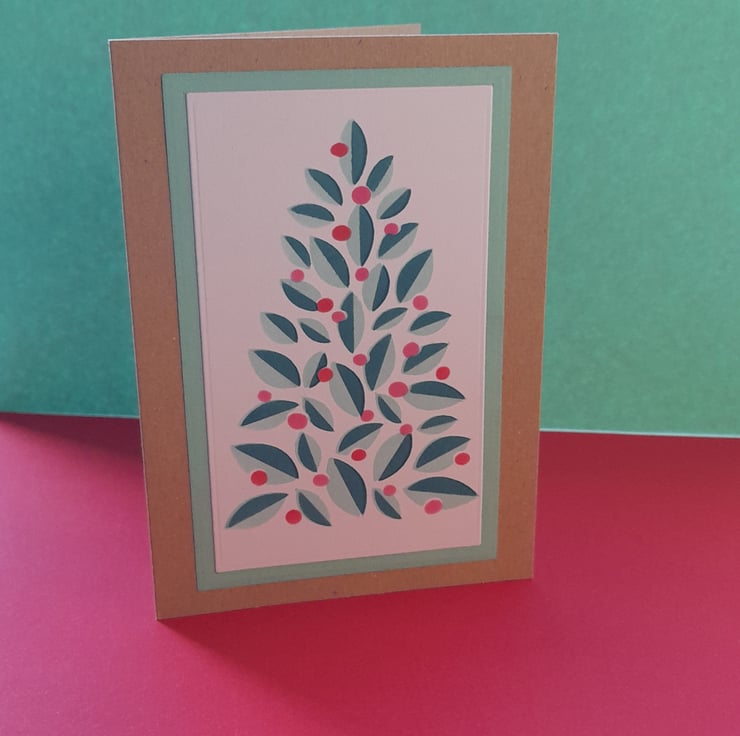 This set of 3 cards includes 1 of each design - Poinsettia & Holly, Christmas Tree and Robin & Holly in the Arctic colourway of Teal, deep Pink and warm Red. Each design is mounted on a coordinating mat layer on a recycled kraft card base