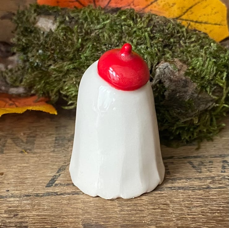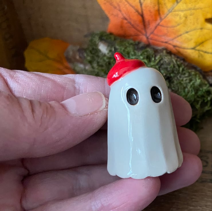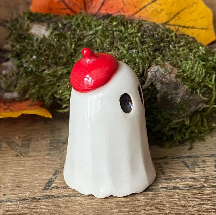 This little ghost is a special price because the glaze on the beret has made it look a little cloudy.This little ceramic ghost decoration has been made from white earthenware clay. It is called Boo Ray (beret) and has been fired twice and finished with a clear, glossy glaze. It measures approx 4.5cm x 3cm. Cute little ghost collectible.