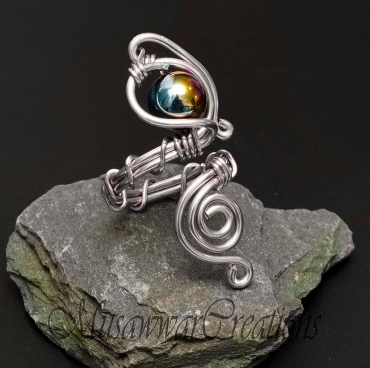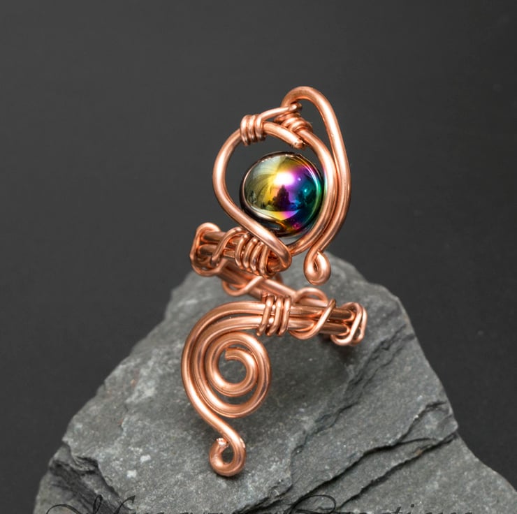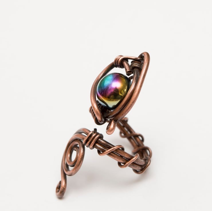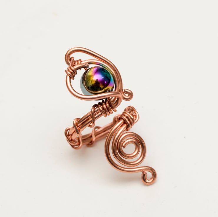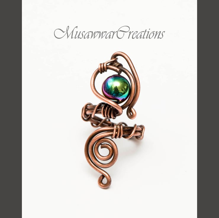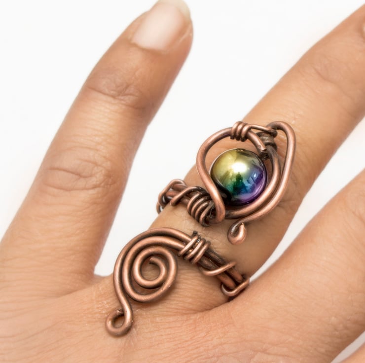 This elegant handmade ring is crafted from antique copper wire and wrapped with a striking blue-coated faceted hematite drum bead, giving it both sparkle and character. Its rustic copper finish paired with the deep blue shimmer makes this ring a timeless piece of artisan jewelry.