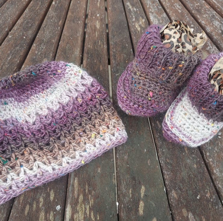 This sweet set is a perfect baby gift for the colder months. In tones of brown, purples and beige, it's perfectly neutral too.