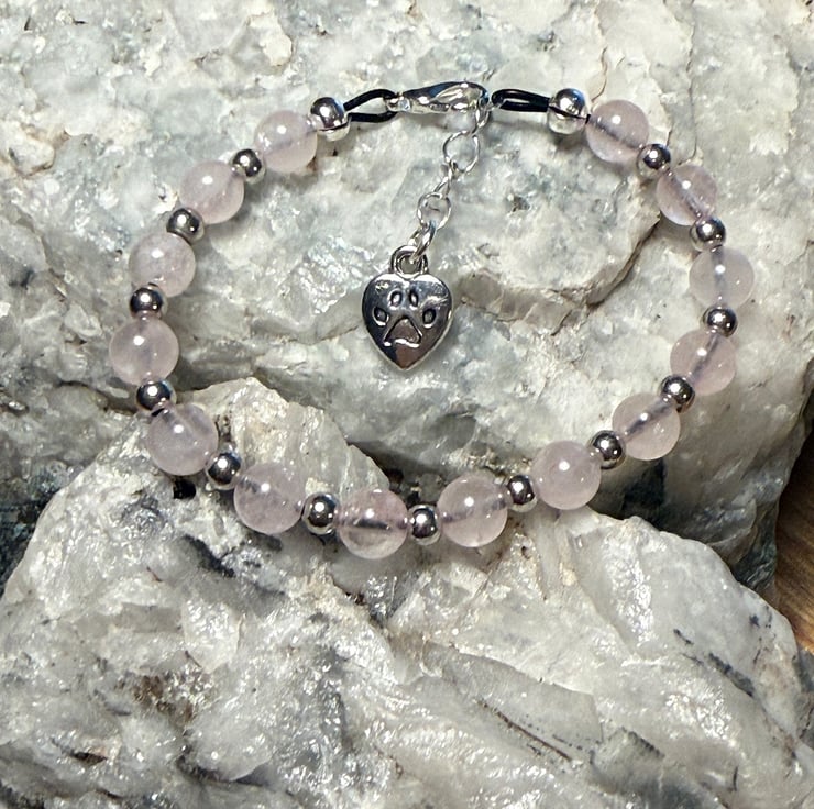 A fun and wearable way of expressing your adoration of your 4-legged companion. Hand crafted from natural leather and gemstone with a lobster claw clasp and extension chain. Silver coloured spacer beads match the fastenings and add a lustre that complements the natural beauty of the stones. Fit: 5.5-6.5 inch/14-16.5 cm