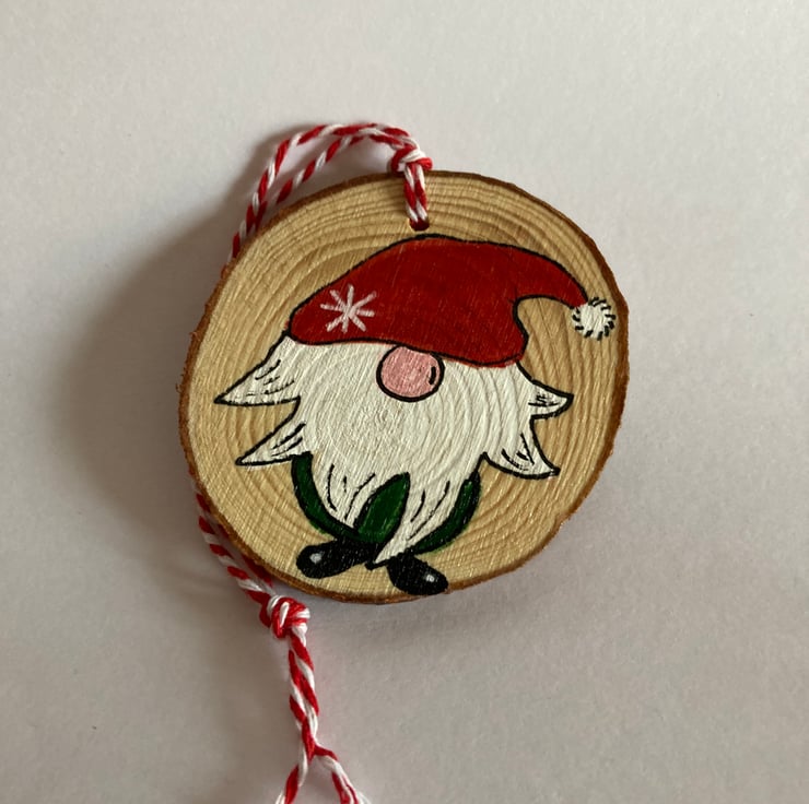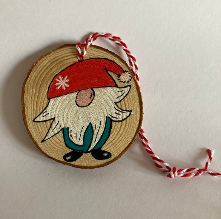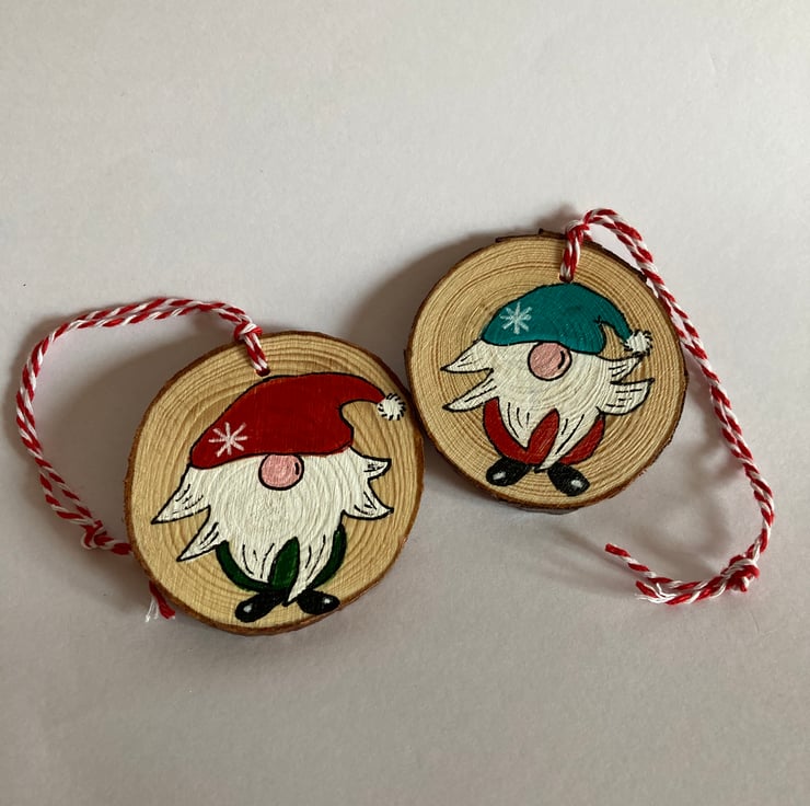 Christmas gnomes are painted on to wooden discs and easy to hang with the red and white twine.