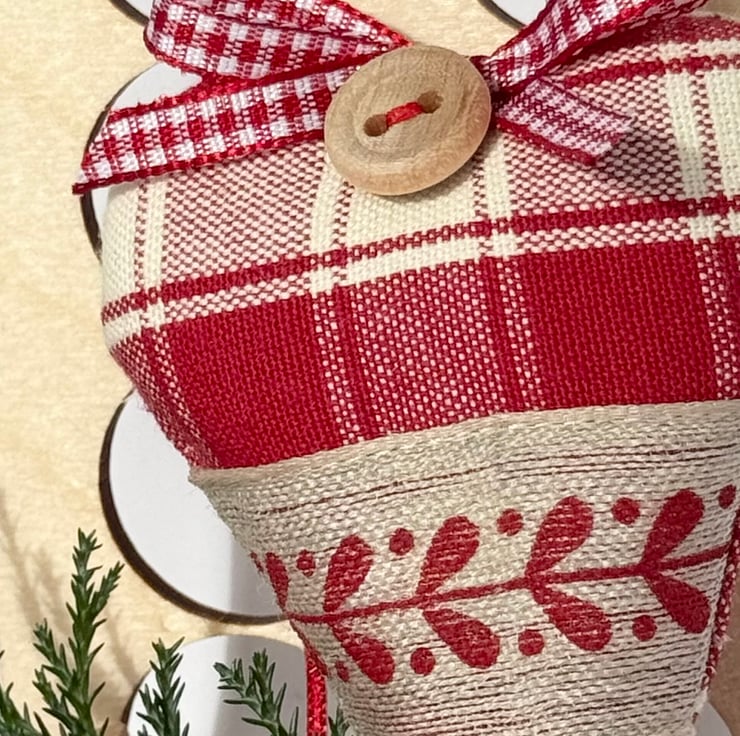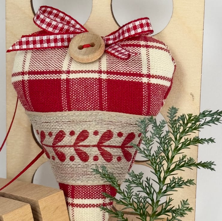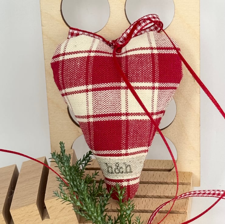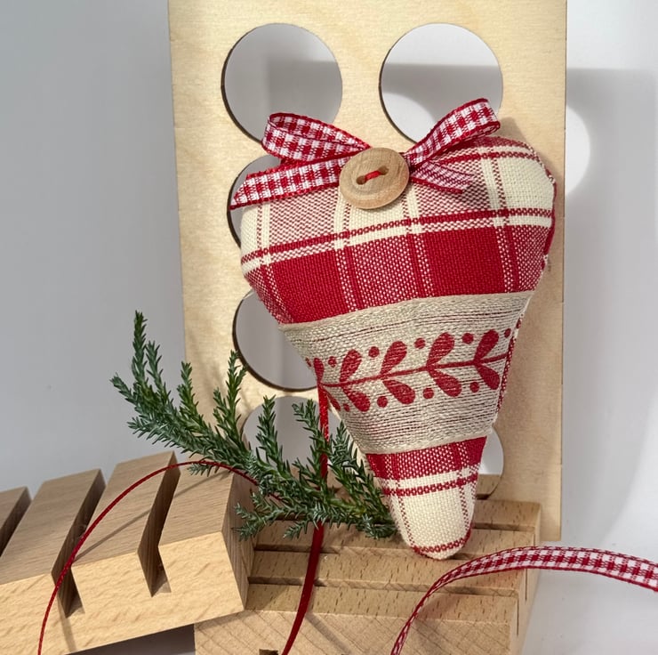 Gorgeous little Christmas mistletoe heart ... In jolly red and white checked woven cotton fabric, with a beautiful ecru linen ribbon band depicting a garland of stylised red mistletoe. Finished with a sweet wooden button, narrow shiny red ribbon hanging ties and a cheerful red and white gingham ribbon bow. And filled with hypoallergenic wool toy stuffing and a generous pinch of whole cloves for a long-lasting warm and spicy Christmas scent.
