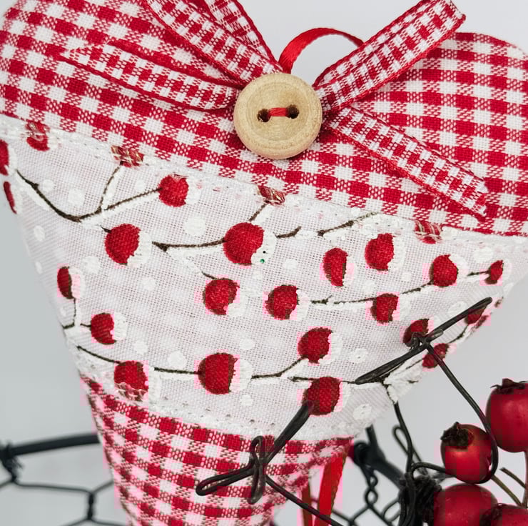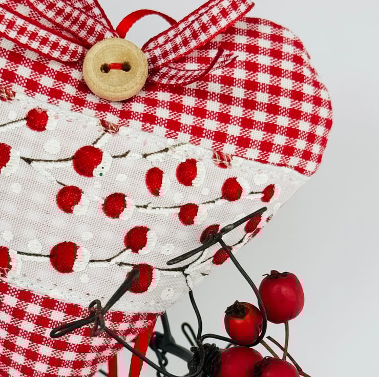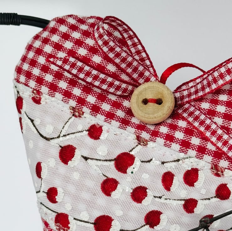 In cheerful red and white gingham, the Winter Berries Heart encapsulates a bright snowy morning, with a broad ribbon band featuring red snow-capped berries on bare branches. For extra festive winter sparkle the edges of the ribbon are interwoven with a little silver glitter thread.