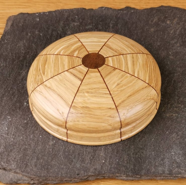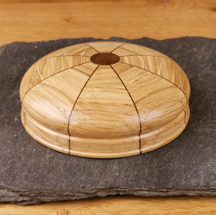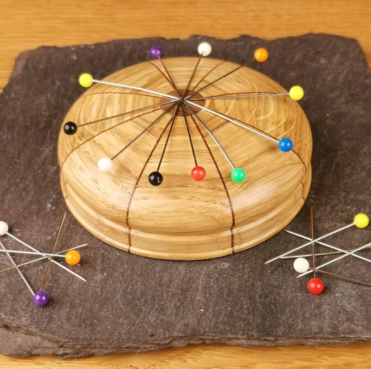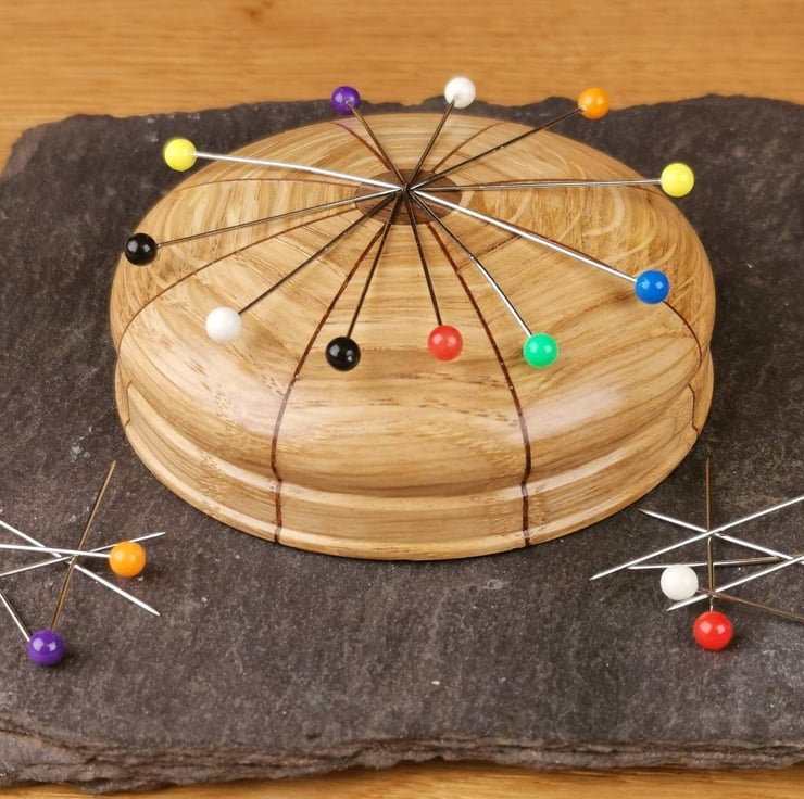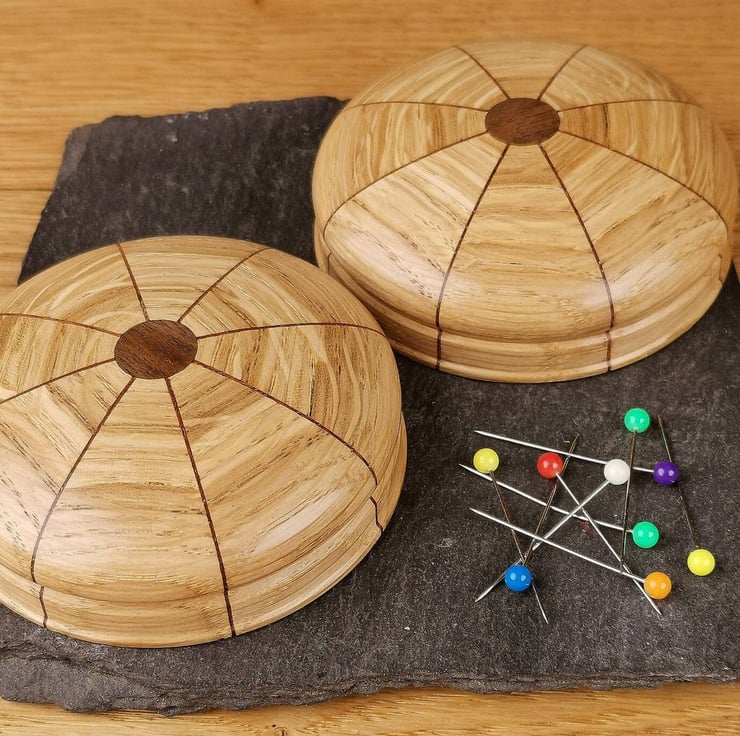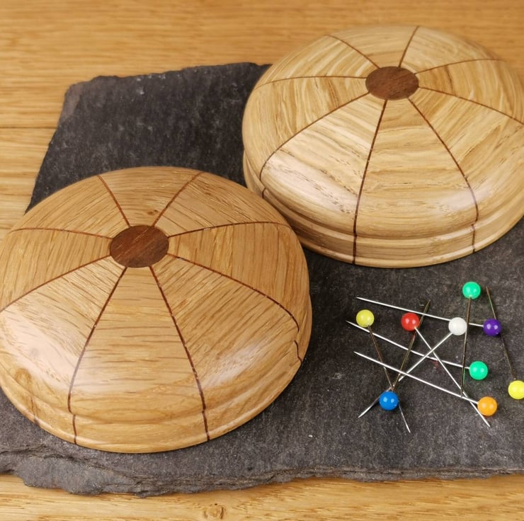 This magnetic needle keeper is the ideal way to keep your needles and pins organised and the perfect addition to your sewing kit! Crafted from Oak segments with striking Walnut veneers, each minder features a rare earth magnet covered by a central Walnut inlay.