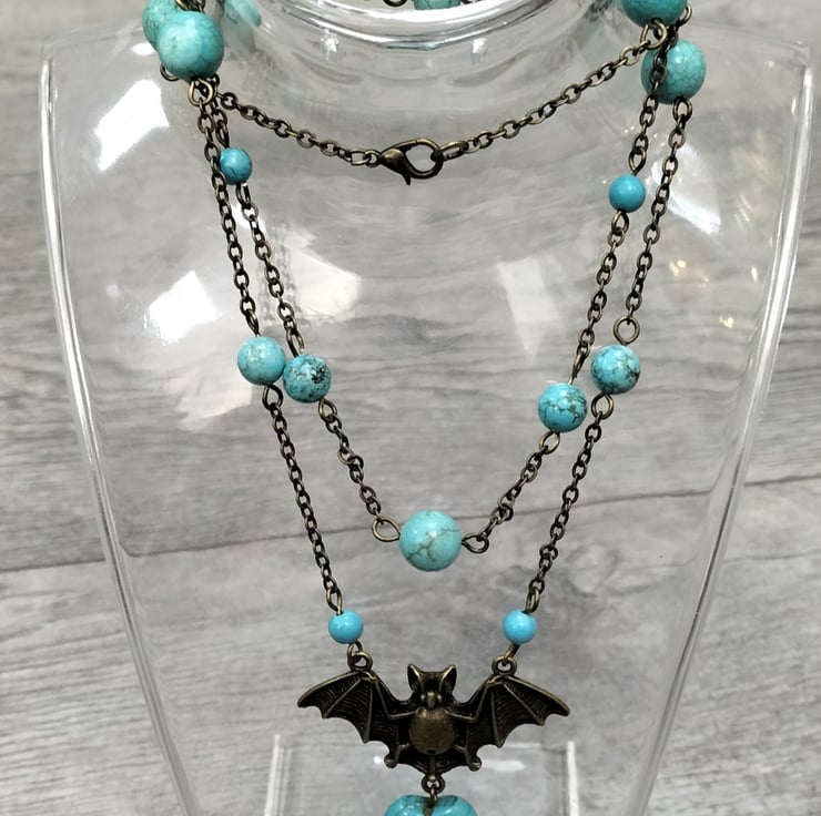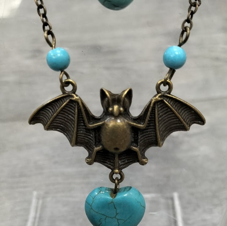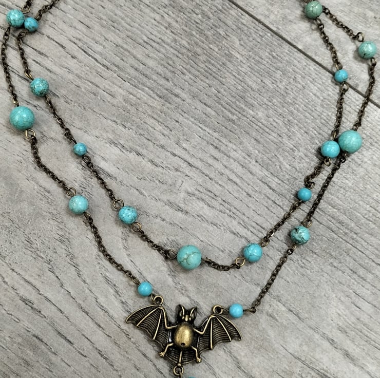 The turquoise beads look stunning alongside the antique bronze finished chain and bat.
