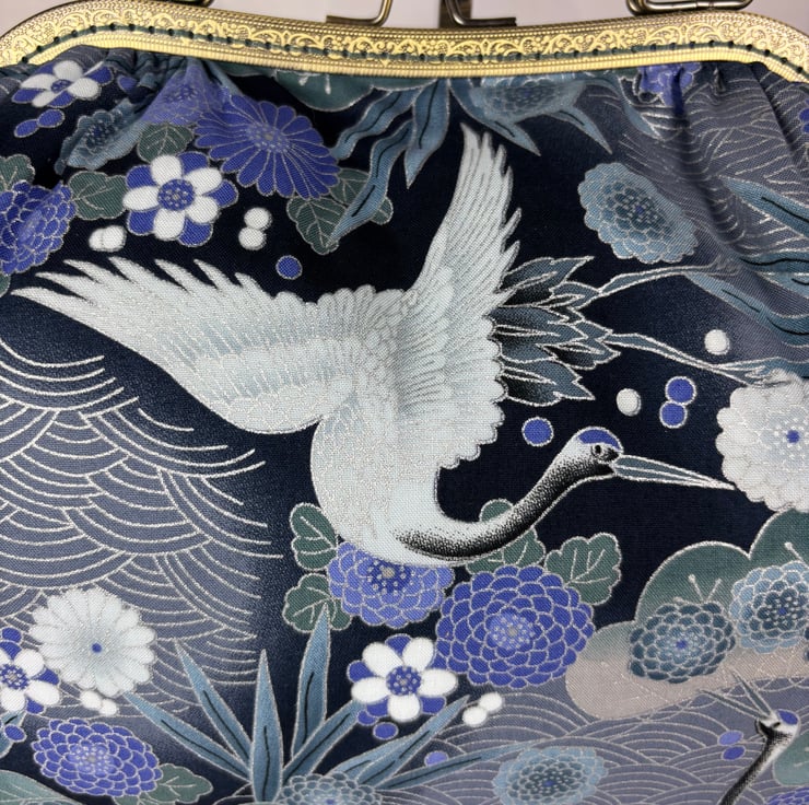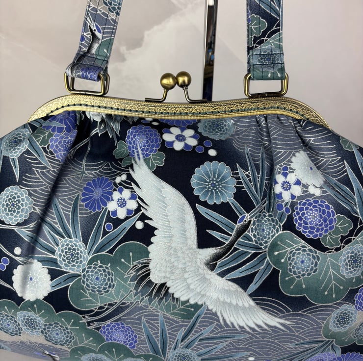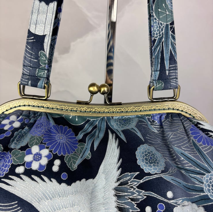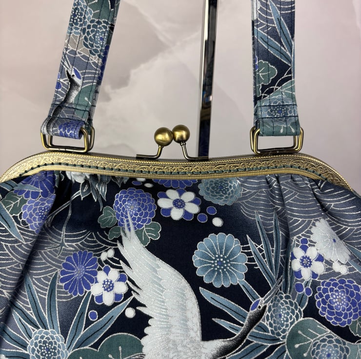Handmade kiss clasp bag in a stunning blue-green, mauve and silver Japanese cotton fabric with stylised oriental elements generously accented in silver.
