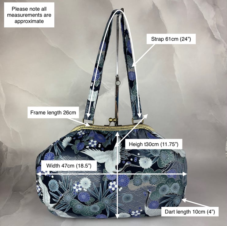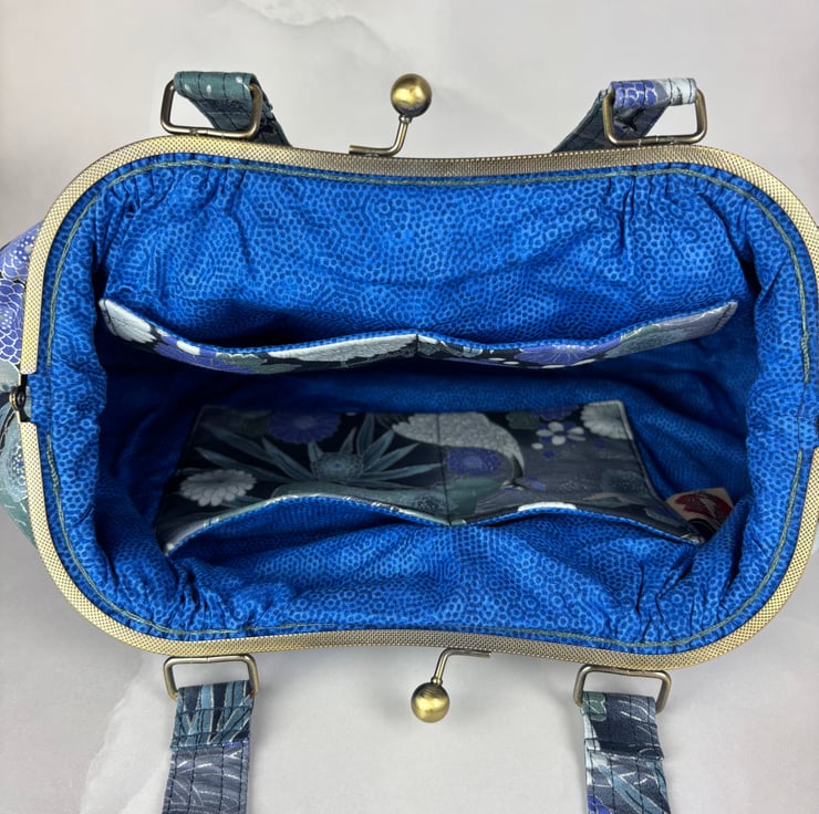 I have lined this lovely bag in a rich blue patterned cotton fabric and added 2 matching shoulder length straps allowing it to sit comfortably on your shoulder.