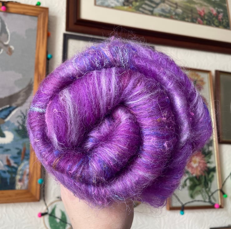 100% Corriedale Wool, hand dyed throwers silk & purple Sari Silk, blended by Sammy in her home studio. This purple, 3 shade blend is inspired by childhood trips to the wool shop where the owner always kept any new deliveries of my mum's favourite colour behind the counter so she could see them first!